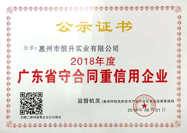 熱烈祝賀惠州市恒升實(shí)業(yè)有限公司榮獲2018年"守合同重信用企業(yè)"稱號(hào)。此項(xiàng)殊榮惠州市恒升實(shí)業(yè)有限公司已經(jīng)連續(xù)十五年獲得!衷心感謝社會(huì)各界人士對(duì)恒升公司給予的關(guān)心和支持!